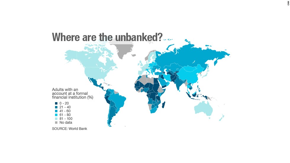 *Note: the term 'unbanked' is represented here by a World Bank measure of the percentage of people in a country that hold an "account at a formal financial institution" such as a "bank, credit union, another financial institution (e.g., cooperative, microfinance institution), or the post office (if applicable) including respondents who reported having a debit card".